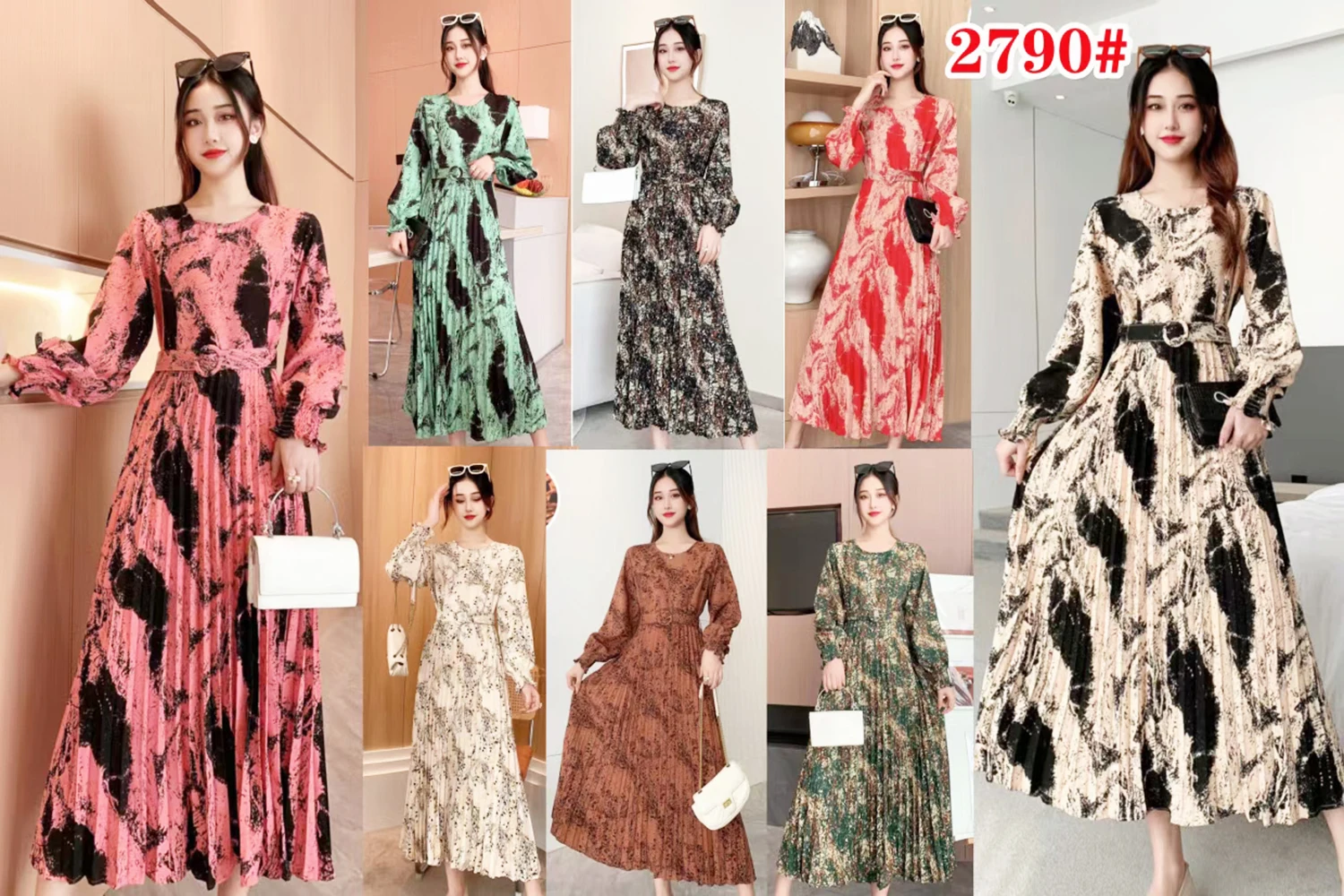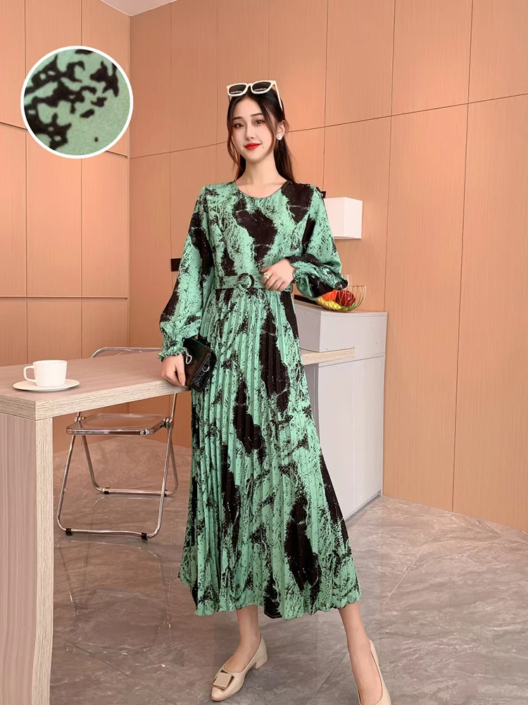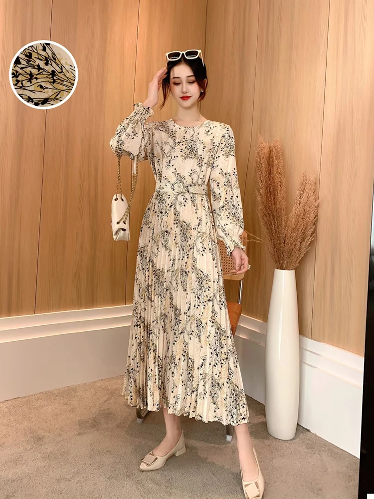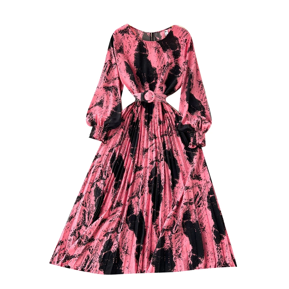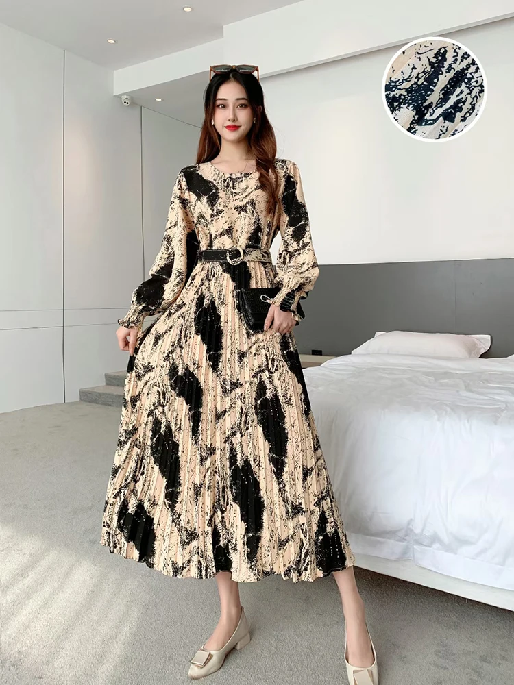 Women Spingh Autumn Dress Vintage Printed Heavy duty Pleated Dress Celebrity Temperament Small Stand Collar Fitted Dress D2038
